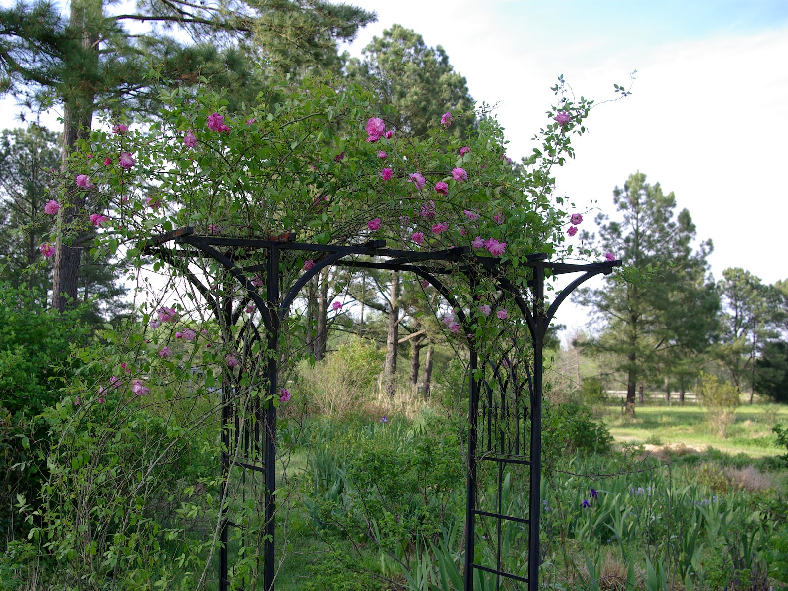 'Climbing Old Blush' is looking good, although she suffered what could have been a real setback this winter. The wind blew the trellis over, heaving up the roots of both roses on each side, along with the big hunks of concrete at the bottom of both side of the trellis. DH put in rebar, poured new footings, stuck the roses back in, and they seemed to be fine.