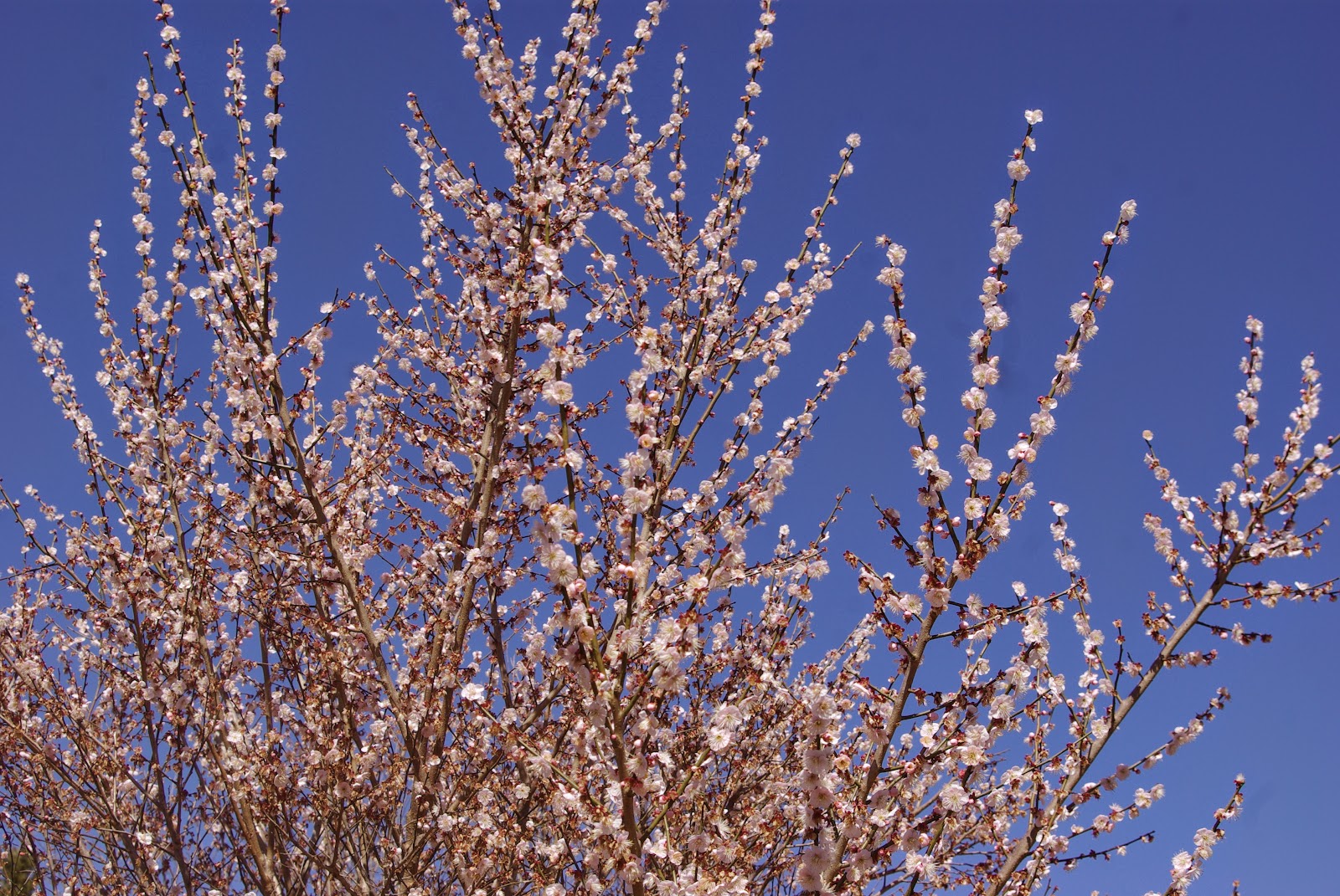 The other two trees are almost like twins, and much like the tree I planted in the big bed, with cupped dark pink flowers. There was a 'Matsubara Red' at the Arboretum whose fruit I also gathered and so these are probably offspring of that tree. Like our new red apricot, the flowers smell like sweet cinnamon. They are bigger than both my tree and her white tree.