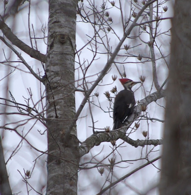 I finally got a couple of pictures of a pileated woodpecker! I see them often, as they like to feed in the tulip poplar stand above the house (where these pictures were taken), and in summer I frequently see them flying back and forth across their large territories.